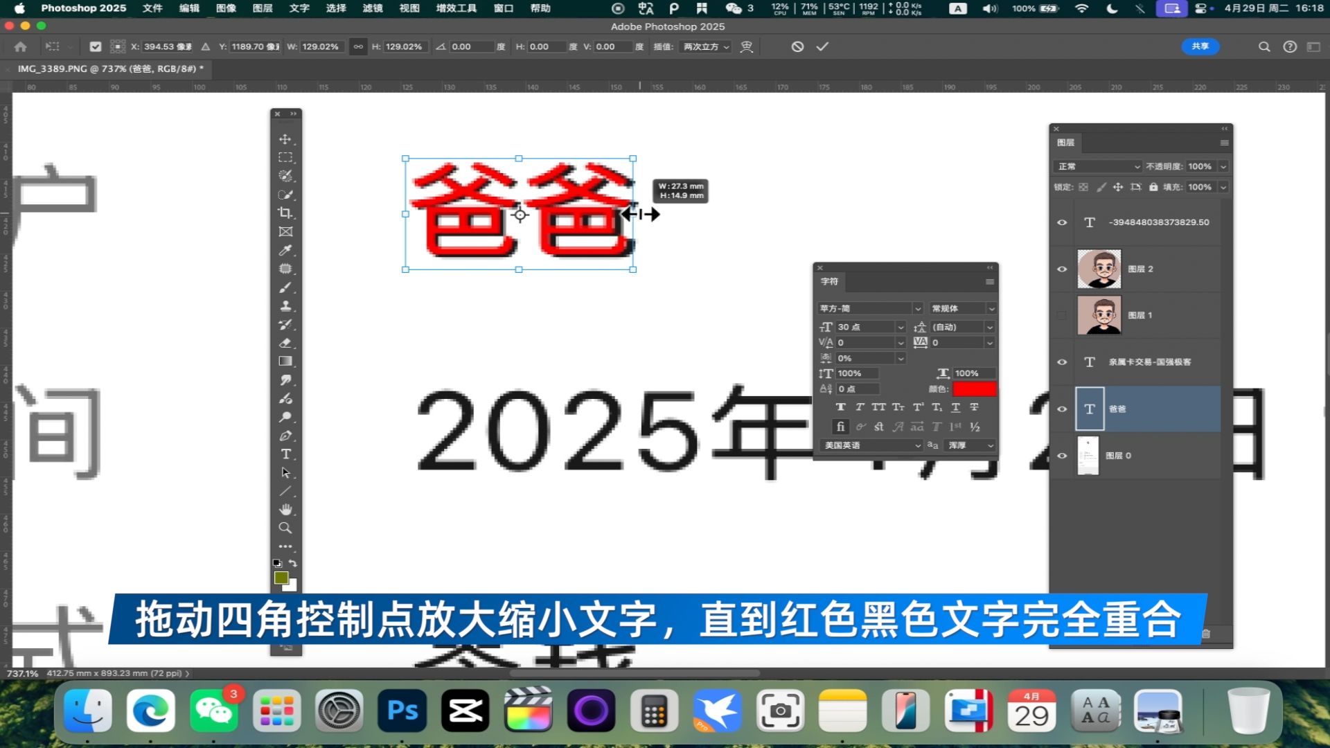 按ctrl+T打开变形,拖动四角控制点放大缩小文字,直到红色黑色文字完全重合。双击红色文字,修改成自己想要的内容,最后在字符面板点击颜色,吸取原图上文字颜色即可。