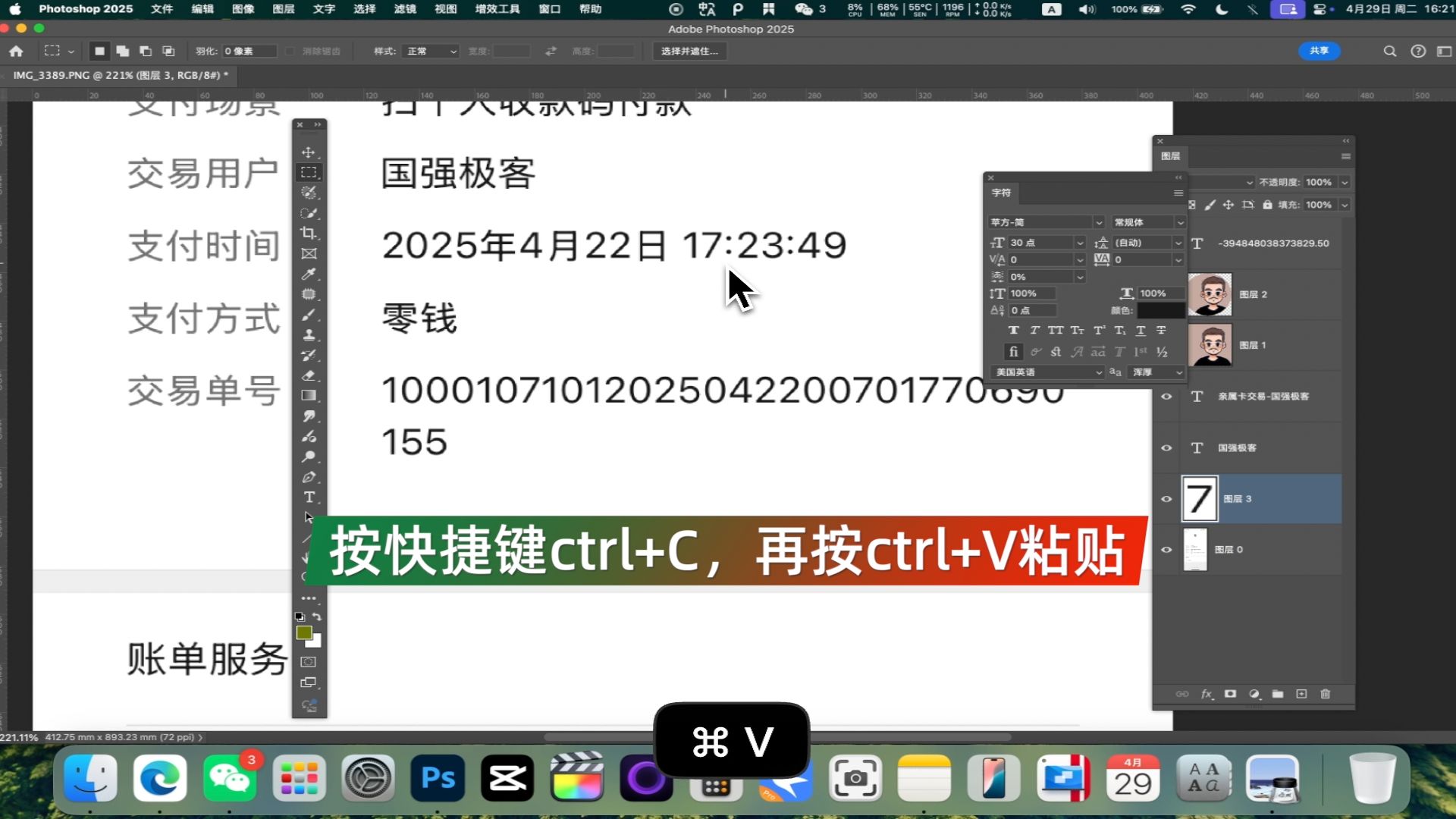 对于支付时间和交易单号的修改,一般需要的数字图片里都有,我们可以用选框工具选择需要的数字,按快捷键ctrl+C,再按ctrl+V粘贴,用选择工具把数字移动到需要的位置就可以了。